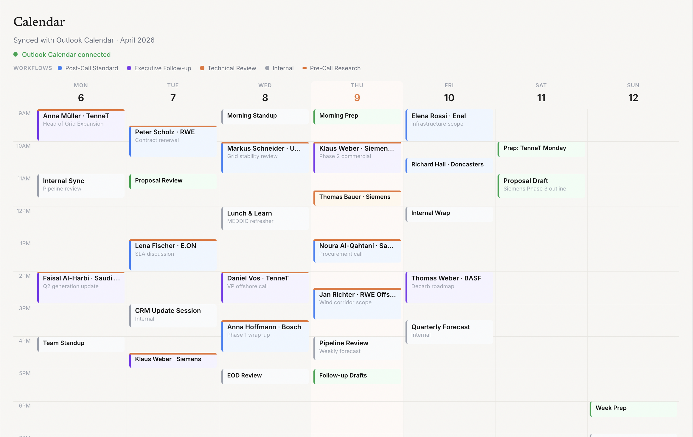 Every meeting tagged with a workflow type. Prep and follow-up triggered automatically.