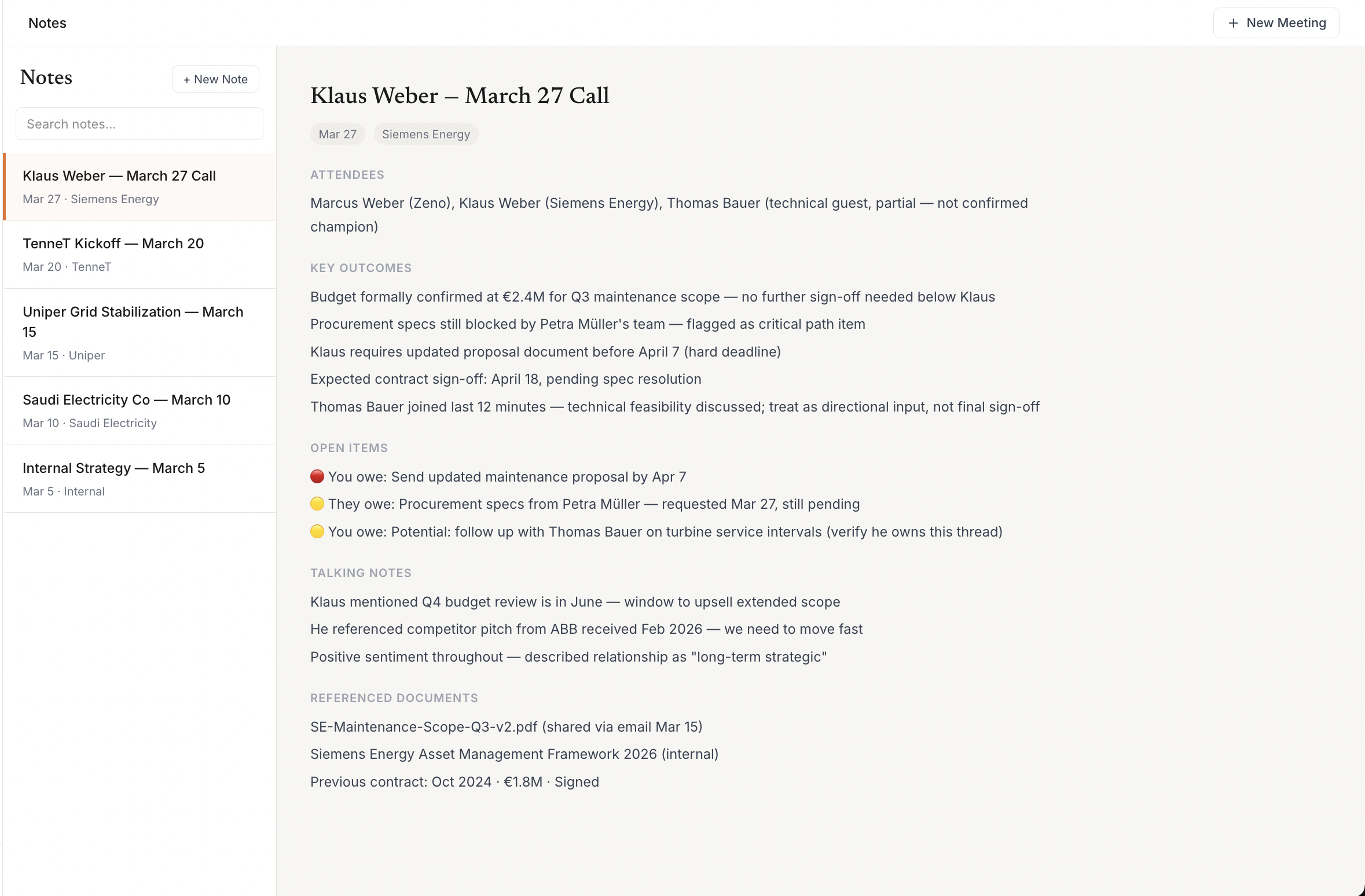 Ask Zeno anything about a contact, a deal, or a past meeting. It knows everything.