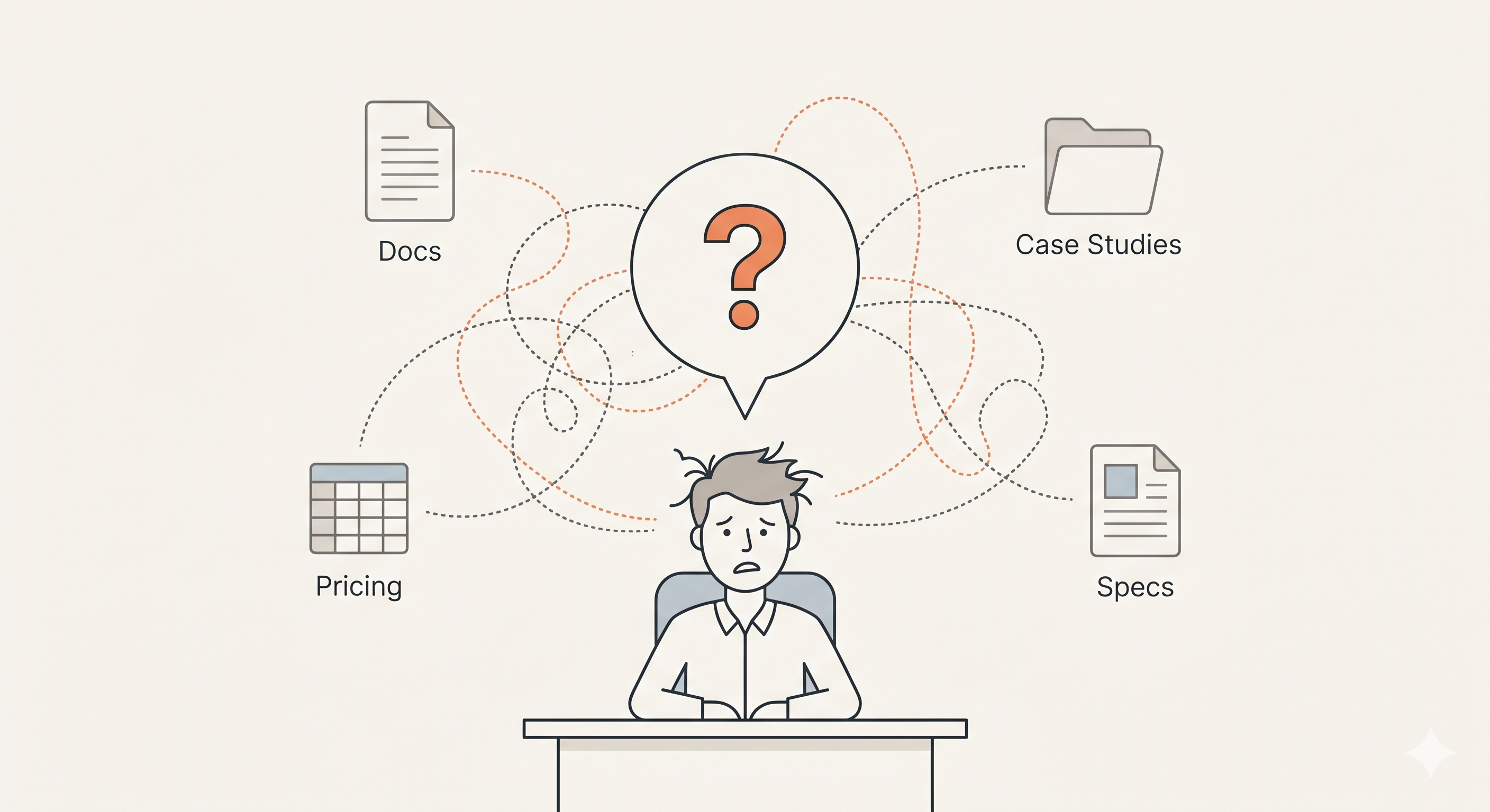 Product specs in Notion. Pricing in a spreadsheet. Case studies in a Drive folder from 2022. When a tough question hits live, you scramble or guess. Scattered information costs you credibility at the worst moment.