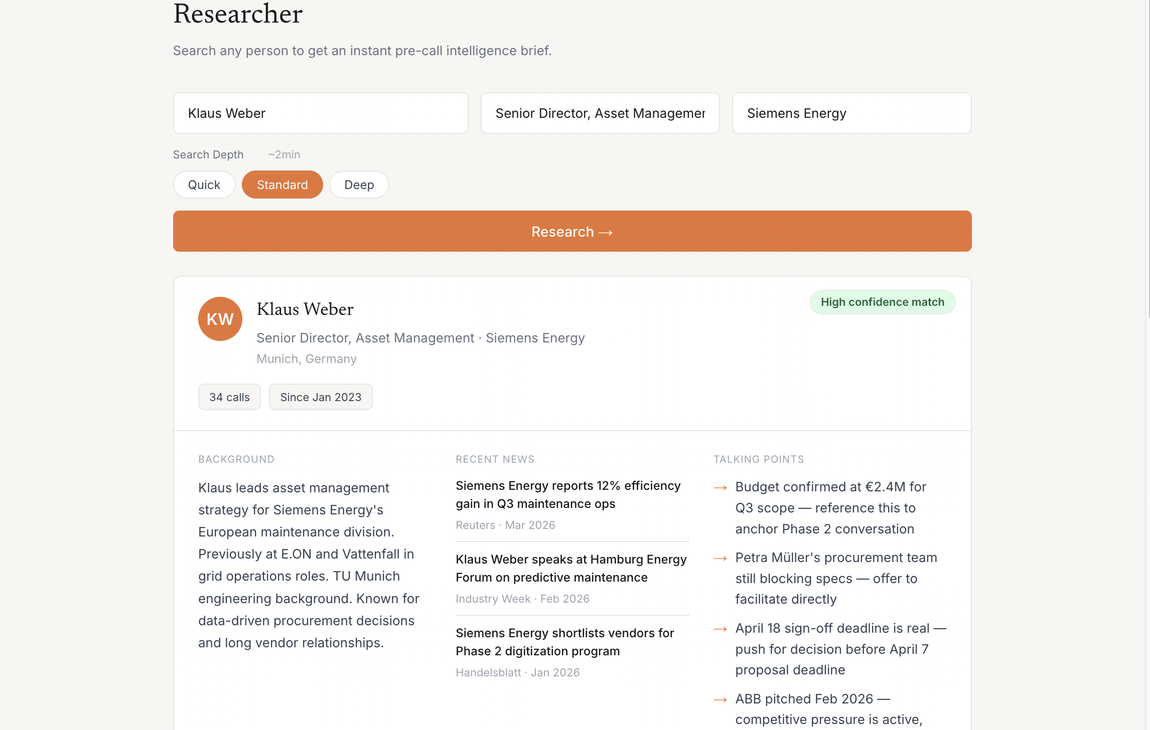 | Pre-call buyer profiling | — | partial | — | ✓ |